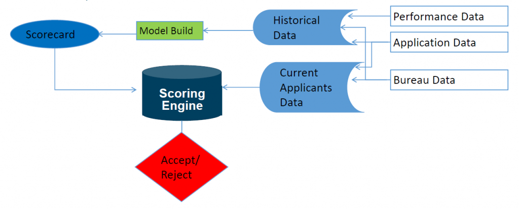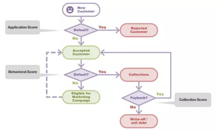 Các loại đánh giá điểm tín dụng khác nhau được sử dụng từng giai đoạn khác nhau trong hành trình của khách hàng đi cùng tổ chức như được mô tả trong hình vẽ dưới: