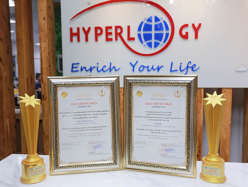 Mới đây, Hyperlogy đã vinh dự nhận được cú đúp Giải thưởng tại Sao Khuê 2023, bao gồm: Giải pháp Smart RM hợp tác với BAOVIET Bank trong lĩnh vực Ngân hàng số và Máy bán hàng tự động thông minh SVM trong nhóm Sản phẩm, giải pháp phần mềm mới. Giải thưởng được đánh giá xét duyệt trên nhiều tiêu chí như tính độc đáo, tính hiệu quả, thị trường, tính năng, công nghệ chất lượng sản phẩm… bởi các chuyên gia hàng đầu trong lĩnh vực phần mềm, CNTT.