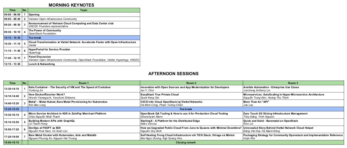 Sự kiện đã mang đến những keynote và những bài trình bày đặc sắc về các xu hướng hiện nay như Cloud, Microservices, Kubernetes, DevOps, Machine Learning, Big Data, IoT… Trong đó, buổi sáng là những bài Keynote đến từ cộng đồng Vietnam Open Infrastructure, OpenStack Foundation và các nhà tài trợ, buổi chiều gồm 21 bài trình bày chia sẻ về các chủ đề công nghệ khác nhau được chia thành 3 phòng.