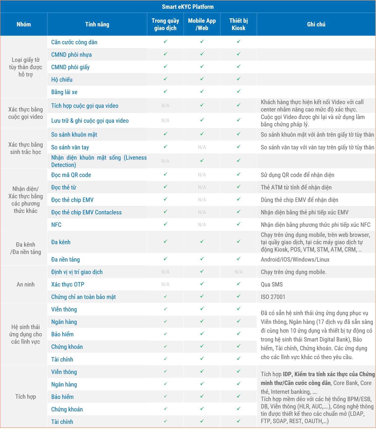 - Định danh và xác thực đa yếu tố: Giấy tờ tuỳ thân bóc tách và tự động điền thông tin vào form mẫu (CCCD/Hộ chiếu/Giấy phép lái xe); Sinh trắc học (nhận diện khuôn mặt, vân tay, giọng nói, lòng bàn tay…); QR Code và các loại thẻ như Thẻ Từ, Thẻ Chip EMV