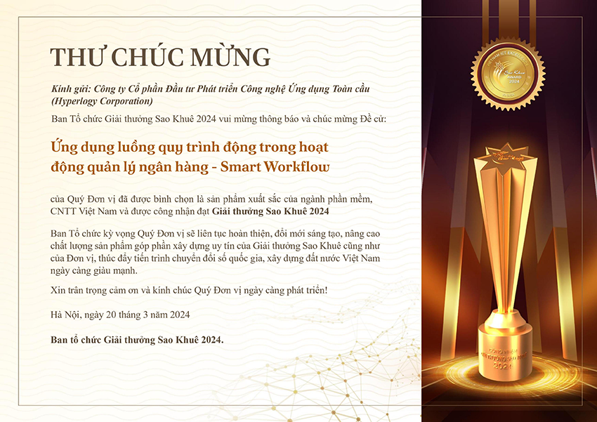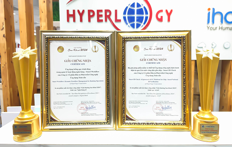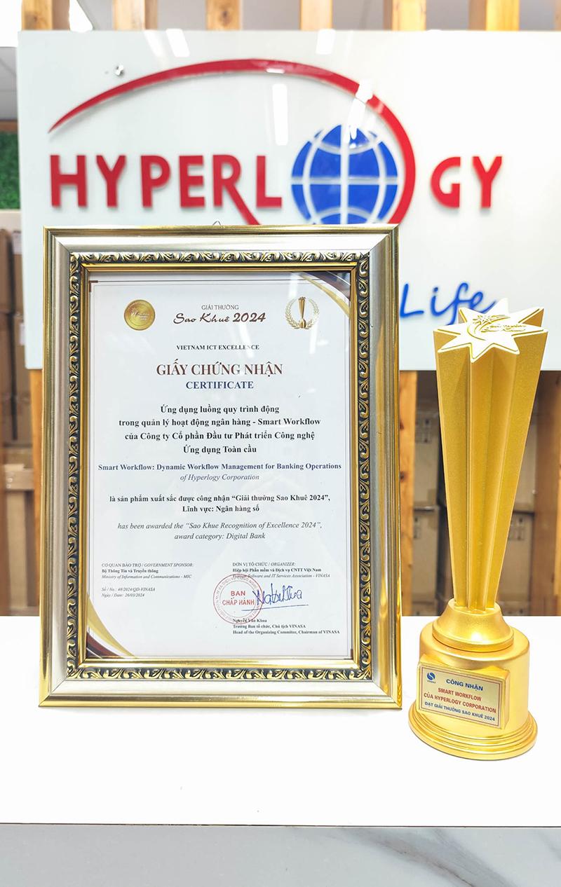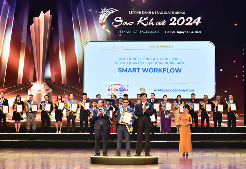 Năm nay, Hyperlogy vẫn tiếp tục chuỗi thành công nửa thập kỷ liên tiếp của mình với cú đúp giải thưởng tại Sao Khuê 2024 dành cho hai sản phẩm Smart Workflow và Smart ID Check. Trong đó sản phẩm Ứng dụng luồng quy trình động trong quản lý hoạt động ngân hàng – Smart Workflow đã vinh dự được xướng tên là “Giải pháp xuất sắc trong lĩnh vực ngân hàng số”.