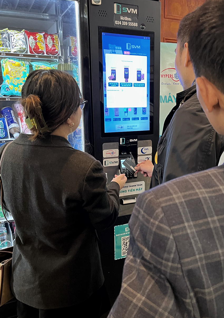Khi trải nghiệm mua hàng tại Máy bán hàng tự động thông minh SVM, khách hàng chỉ cần một thao tác quét mã VietQR hoặc chạm thẻ lên máy POS tích hợp sẵn là có thể nhận được sản phẩm mình muốn.